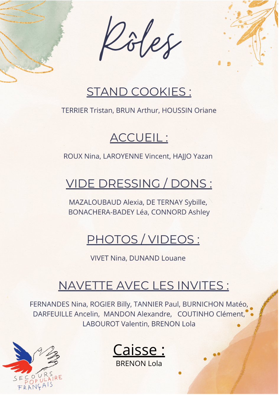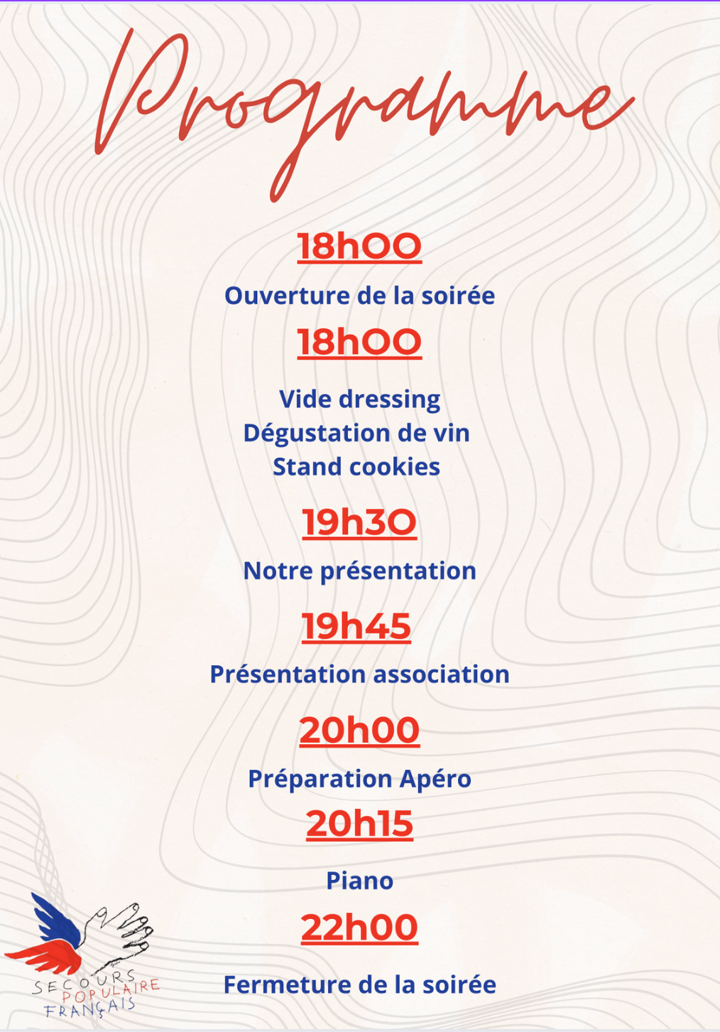 - Pôle Partenariats : Identifier une association partenaire, en l’occurrence le Secours Populaire, pour collaborer sur cet événement. Ce pôle a également trouvé un musicien et organisé une activité complémentaire, la dégustation de vin, afin d’enrichir le programme de la soirée.